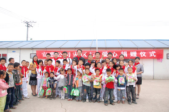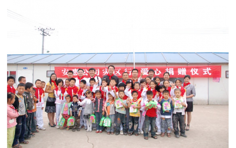 2009年5月12-13日,安惠公司舉行大地震周年系列紀念活動。副總經(jīng)理柯建民再赴德陽,給綿竹拱星小學孩子們送去“愛心包裹”。