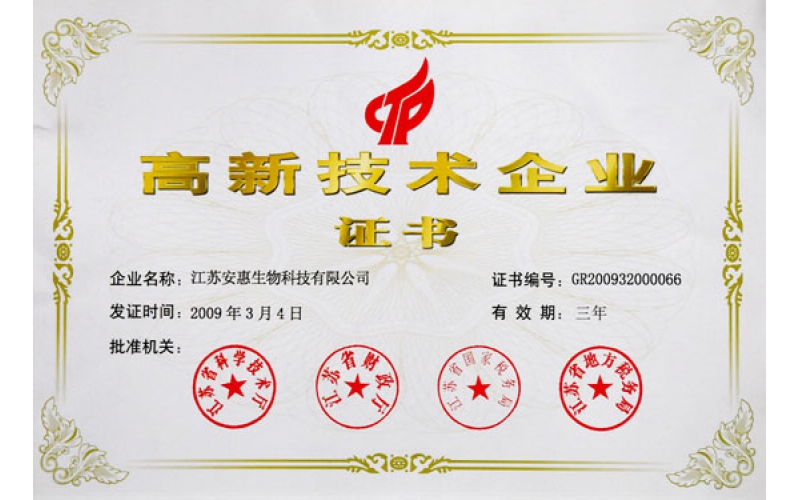 2009年3月4日,安惠公司成為國家高新技術(shù)企業(yè)。